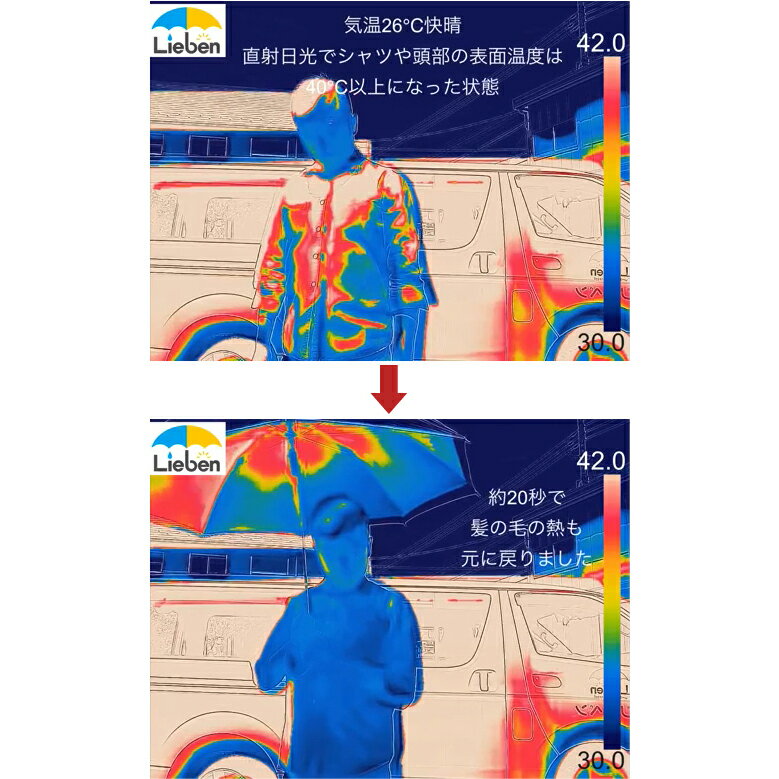 ひんやり傘をさすと、すぐに効果が表れます! 20秒後にはシャツも頭皮の温度も元の状態に戻りました。