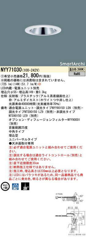 【最安値挑戦中!最大21倍】パナソニック NYY71030 ユニバーサルダウンライト 埋込型 LED(温白色) 中角28度φ55 電源ユニット別売 受注生産品 [∽§]